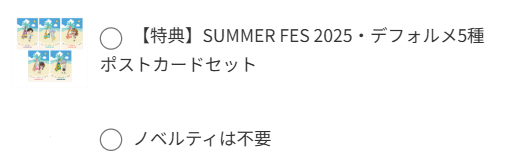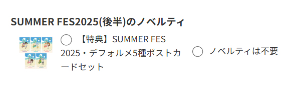 『【特典】SUMMER FES ポストカード 5種セット』をご選択いただき、ご注文完了へ進んでください。