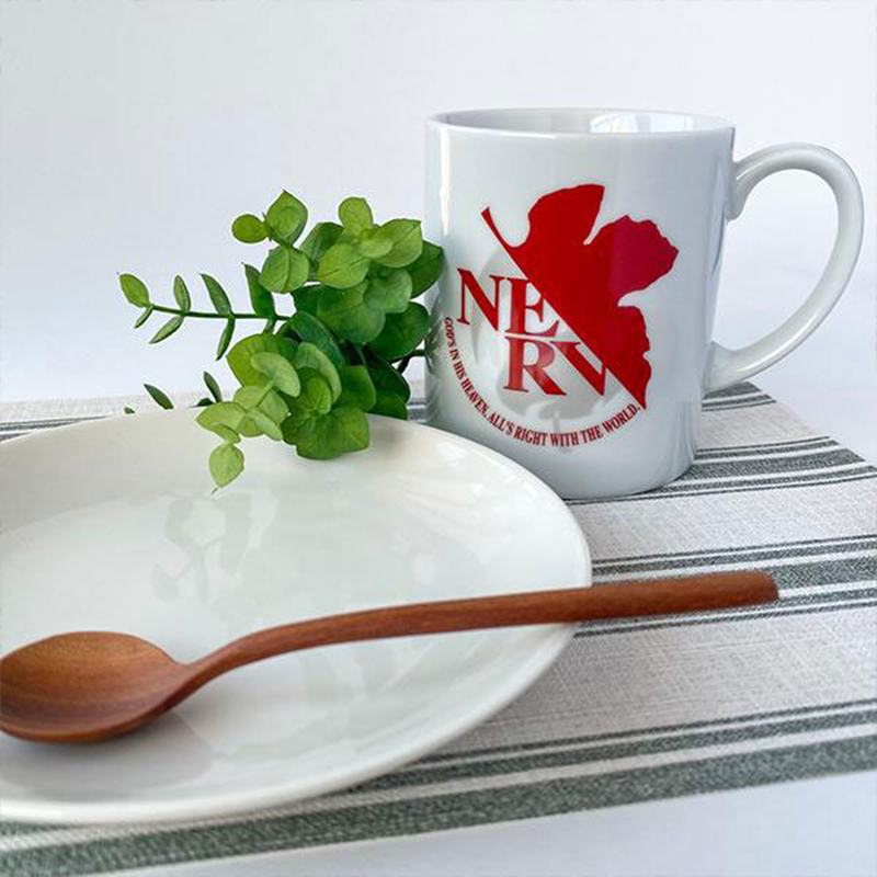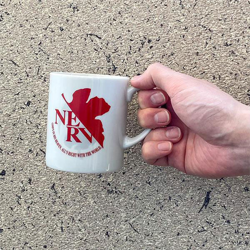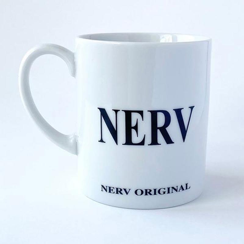 白い磁器のマグカップの両面に、NERVマークと、「NERV」 の文字をそれぞれプリント。