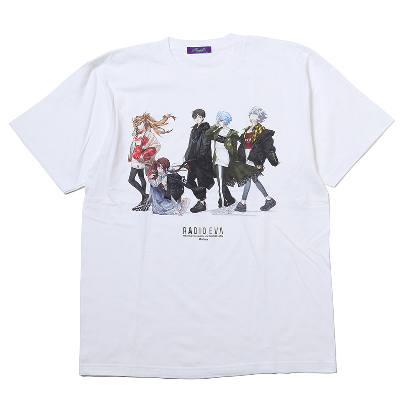 イラストの魅力を最大限に活かすため、ボディーはホワイトとブラックのみの展開。FILAとのコラボアイテムをはじめとしたRADIO EVAアイテムで全身コーディネートしたお洒落なパイロット5名がTシャツになりました。