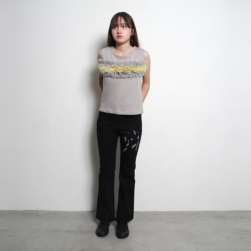 - エヴァンゲリオンの機体カラーであしらったチュール素材をドッキングしたノースリーブカットソー