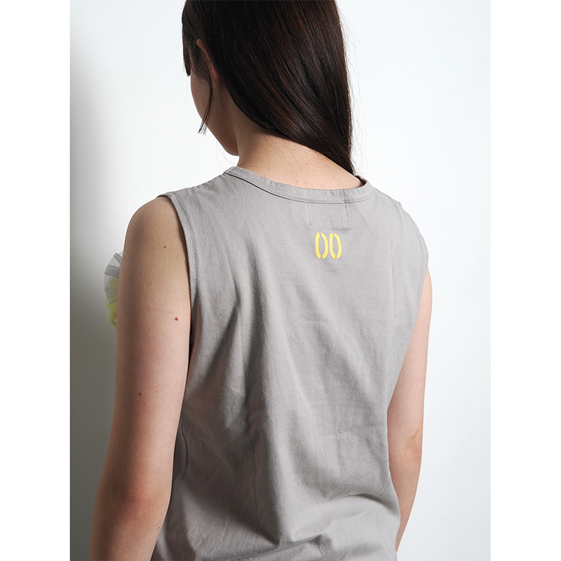 エヴァンゲリオンの機体カラーであしらったチュール素材を胸元にドッキングしたノースリーブカットソー。