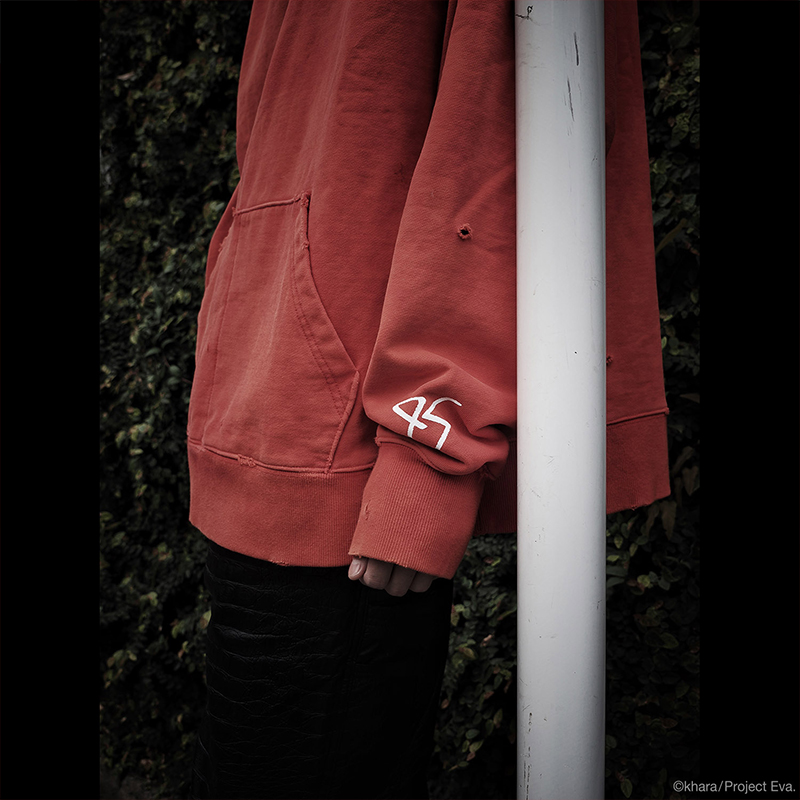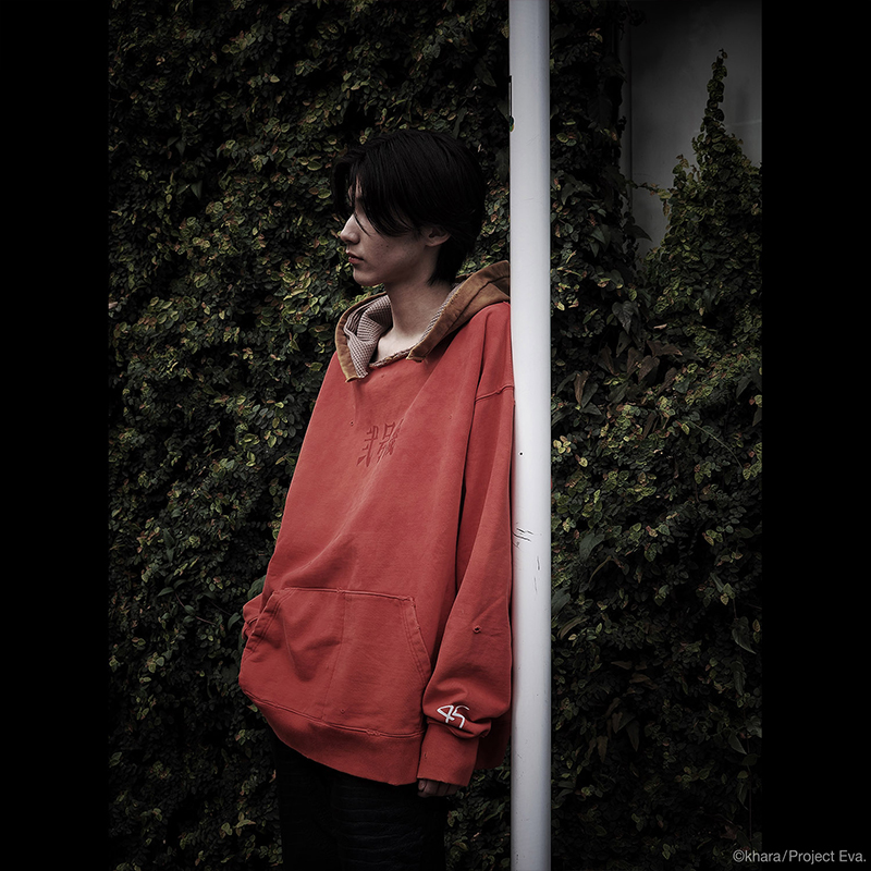 初号機と弐号機、それぞれのキーカラーでもある紫と赤をベースに、フードカラーで味付けしたデザイン。フードの裏地はサーマル張りのW-FACE仕様、ボディーの後染めのムラ感がリアルなビンテージの雰囲気を演出しております。