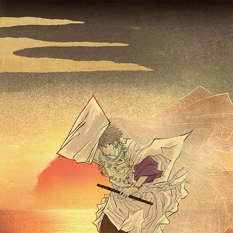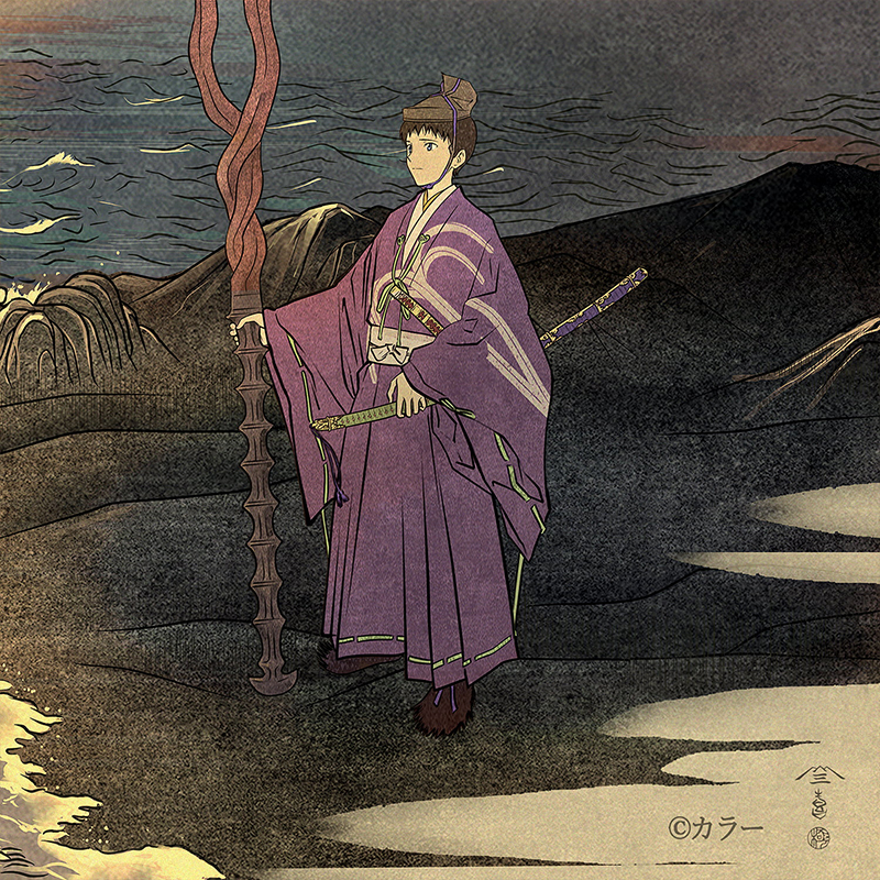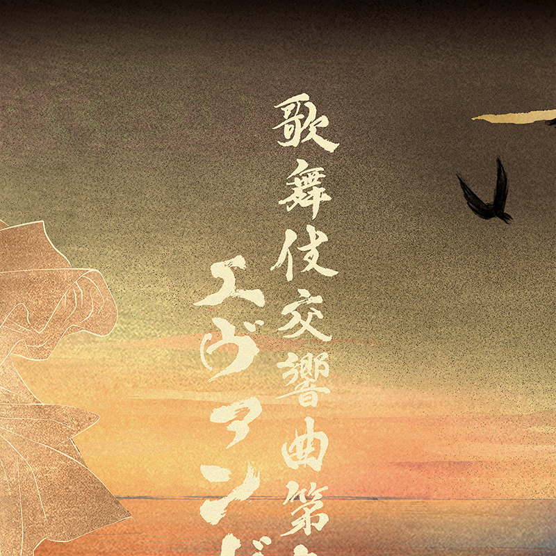 エヴァンゲリオンとエヴァ歌舞伎が持つ壮大な世界観を、神話のような構図で表現したいと考えました。 カヲルを“天を舞う存在”として描き、対するシンジを地に立つ若武者として配置することで、宿命的な出会いを視覚化しています。