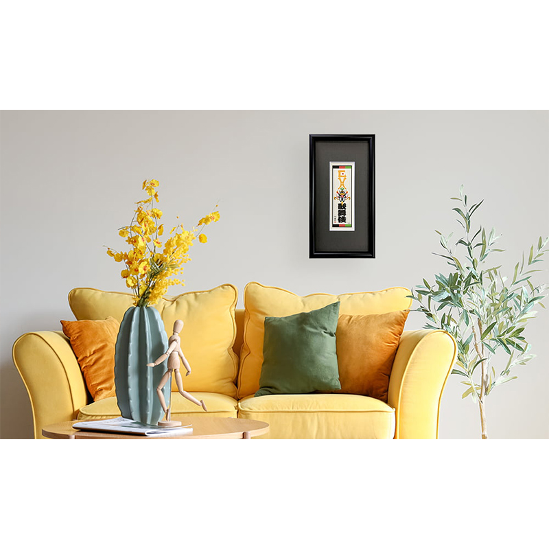 浮世絵の寸法は現代絵画と縦横比が異なるため、既成の額縁では最適なサイズを見つけるのが困難です。 より作品が美しく見えることを考慮し、版三がオーダーした高級感ある額縁に入れてお届けいたしますので、そのまま飾ってお楽しみいただけます。