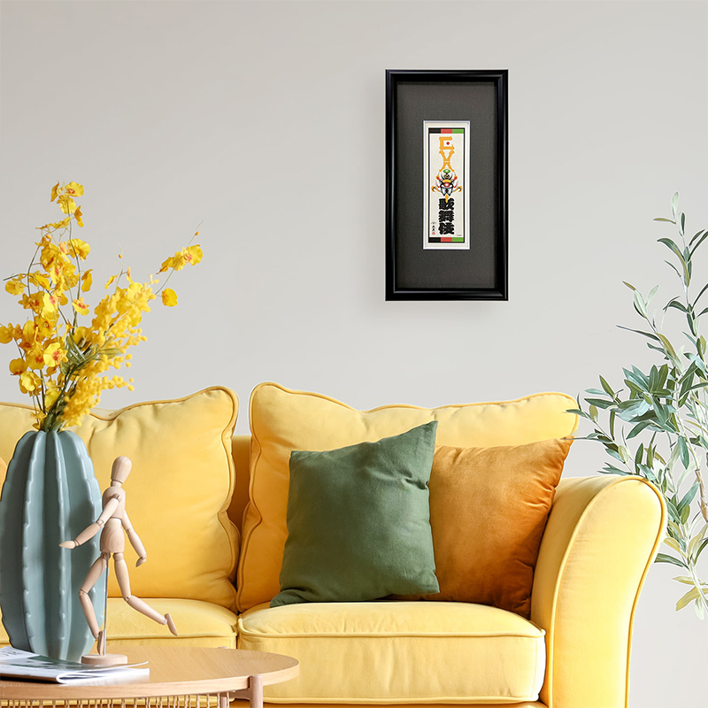 零号機の象徴的なカラーリングを歌舞伎の隈取文様へと昇華し、江戸時代より参拝の証として親しまれてきた千社札の様式美に落とし込みました。