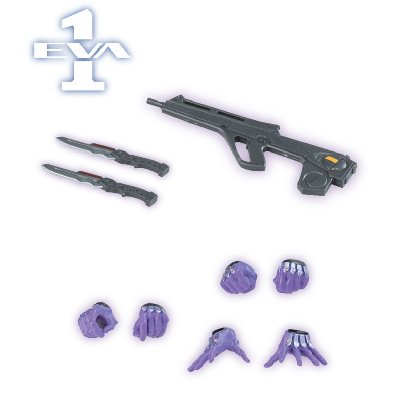 キット内容は エヴァンゲリオン本体×1、ハンドパーツ×3セット、プログレッシブナイフ×2、射出台(専用台座)×1、パレットライフル×1、さらに口の開閉ギミック付きです。