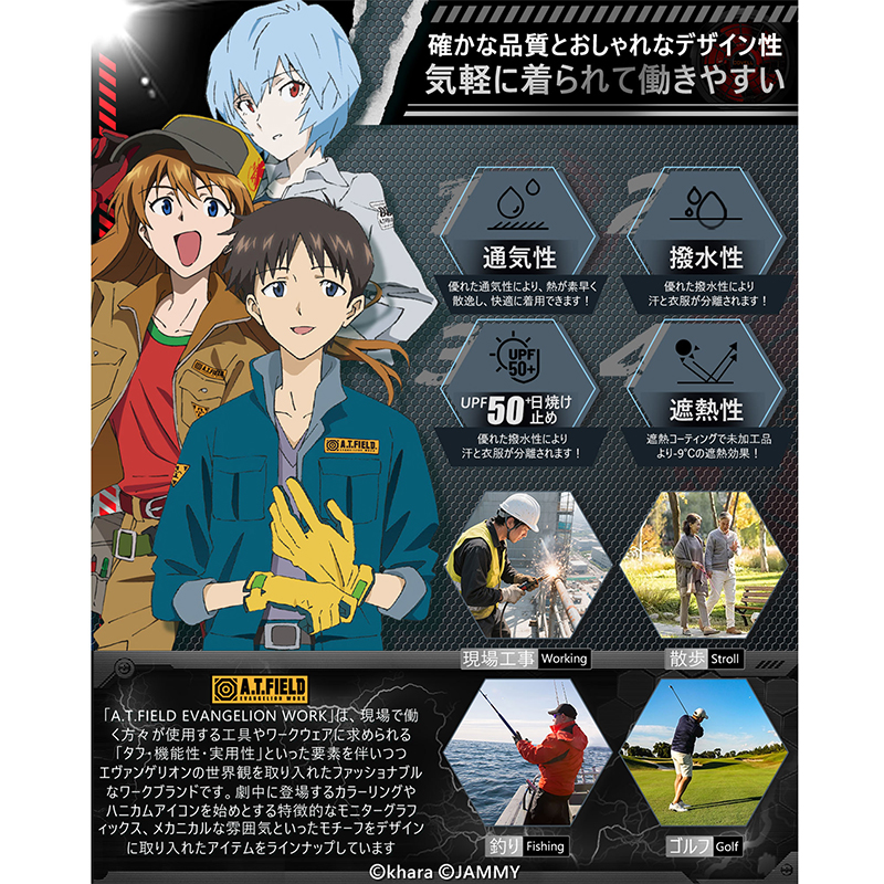 「A.T.FIELD」は(株)JAMMYが「EVANGELION(エヴァンゲリオン)」のライセンスを管理する(株)グラウンドワークスの許諾の元に立ち上げた現場で働く方々が使用する工具やワークウェアに求められる『タフ・機能的・実用性』といった要素を伴いつつ、エヴァンゲリオンの世界観を取り入れたファッショナブルなワークブランドです。