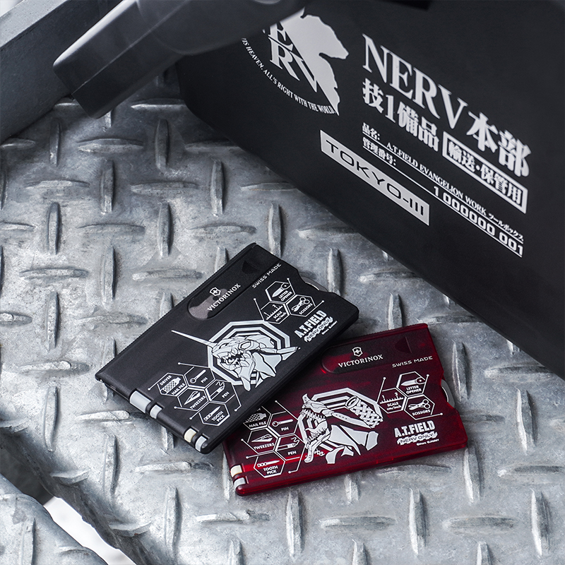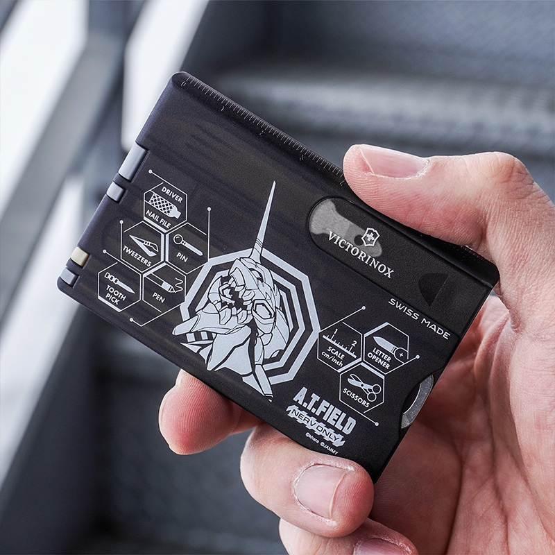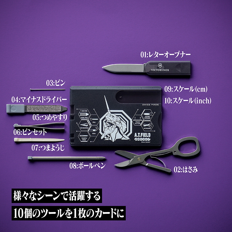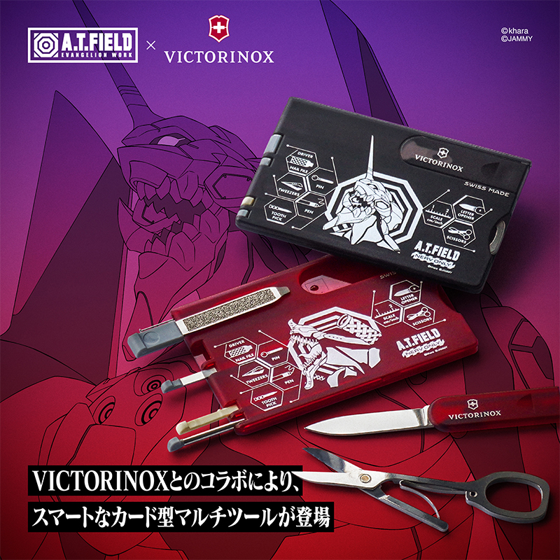 ●エヴァンゲリオンのワークブランド「A.T.FIELD EVANGELION WORK」と、1884年スイスでナイフメーカーとして創業以来、高品質・高機能なマルチツールを製造し続ける「VICTORINOX(ビクトリノックス)」の代表的なアイテムの1つ「スイスカード」のコラボレーションモデルです。