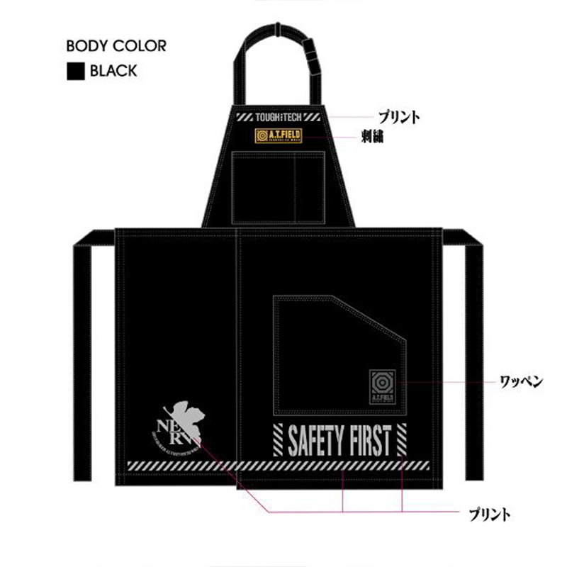 胸元にはA.T.FIELDのロゴを刺繍、エプロン下部にはネルフロゴとSAFETY FIRST、ポケットにはA.T.FIELDタグが縫い付けられています。