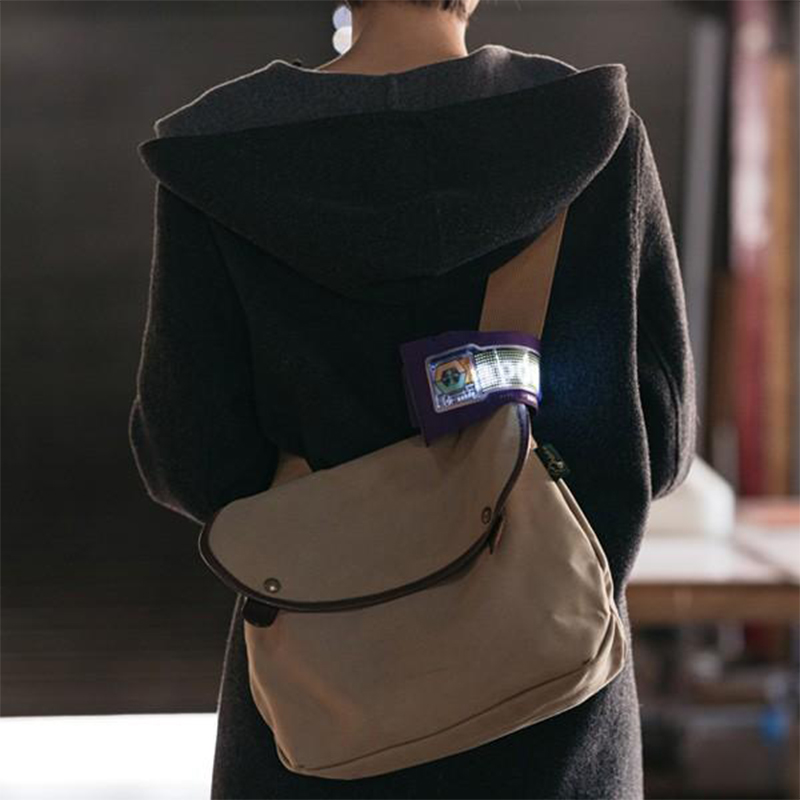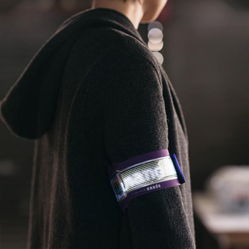 ウェアラブルLEDディスプレイ「FLEX SIGN anode」の特徴は、曲げられる、スマホでメッセージを変更できる、12時間使用可能、軽さ20gです。